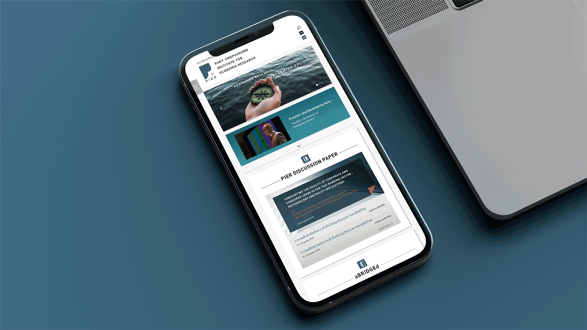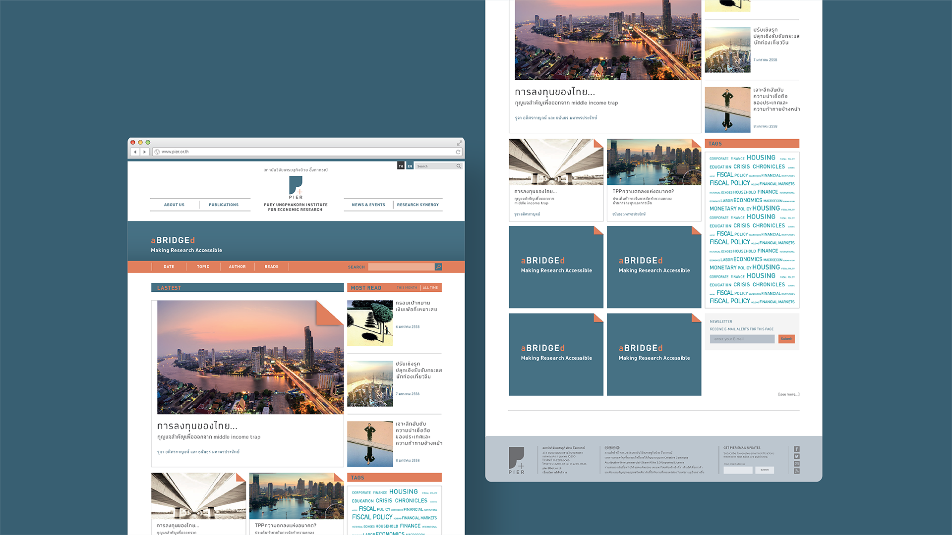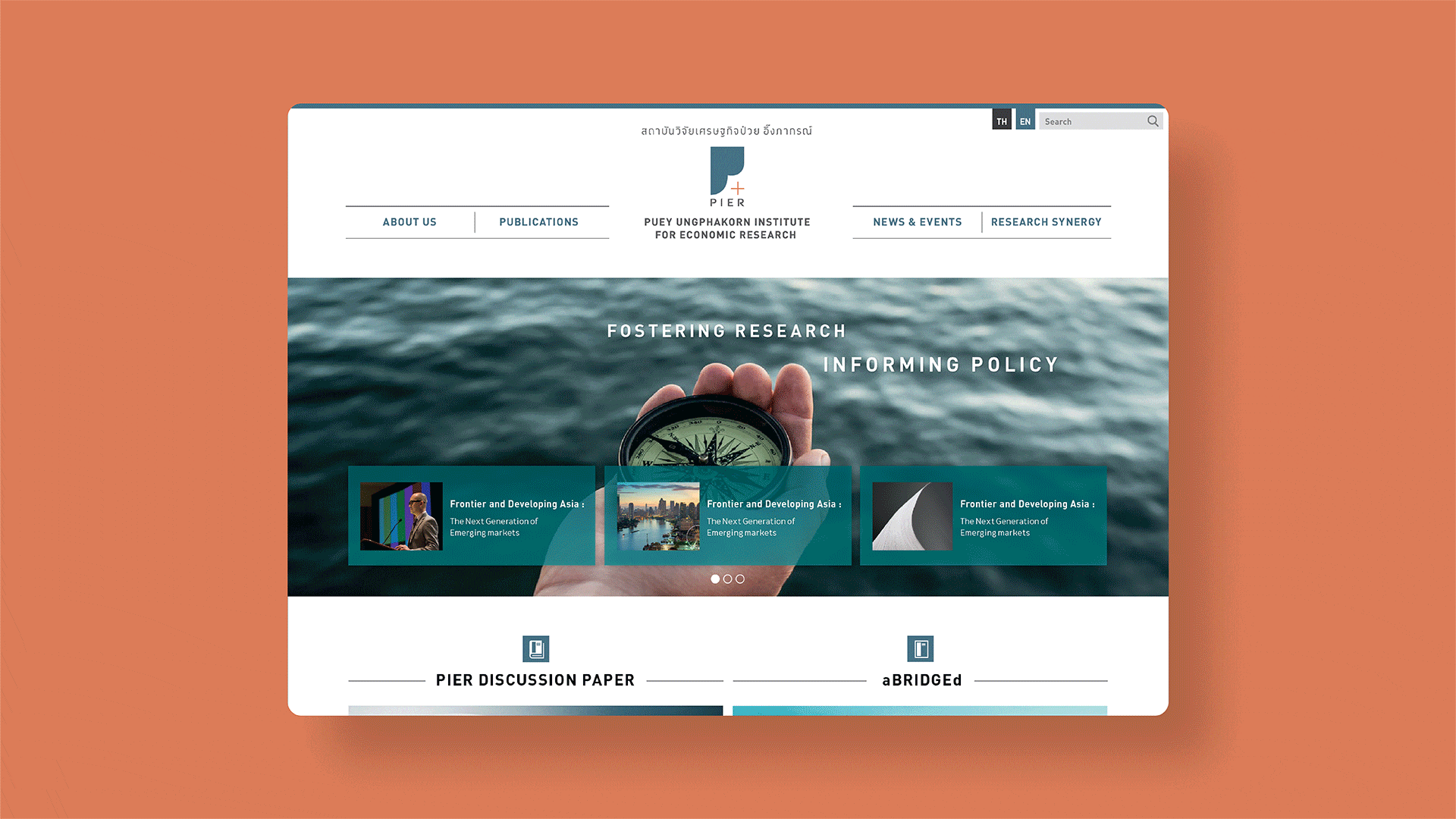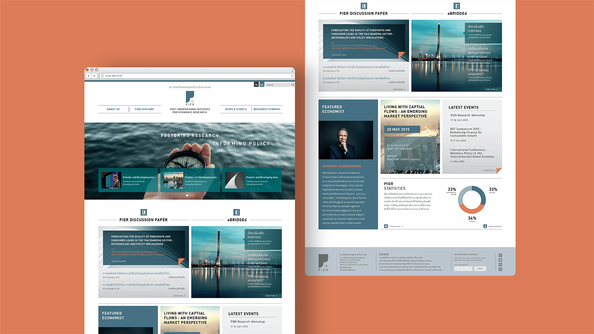 It is universally known that good economic policymaking is grounded on sound and comprehensive economic research. For Thailand, a major obstacle for achieving such purpose has always been lacking policy-relevant knowledge base, due to lack of a “common space” for academics and researchers. To close this gap, Puey Ungphakorn Institute for Economic Research (PIER) was founded by BOT (Bank of Thailand) to provide that much-needed common space for the research community. Therefore, its official website that we develop as a continuing project from the identity design aims at providing the easy-to-access research platform for the benefits of public usages. Inspired by the structure of a newspaper; we design and arrange the website contents according to newspaper layouts, be it the headings, the columns, or the grid systems. And to make it most resourceful, we also analyse the content format and the up-to-date articles before crafting for users the platform that gives the easiest and most satisfying experience.