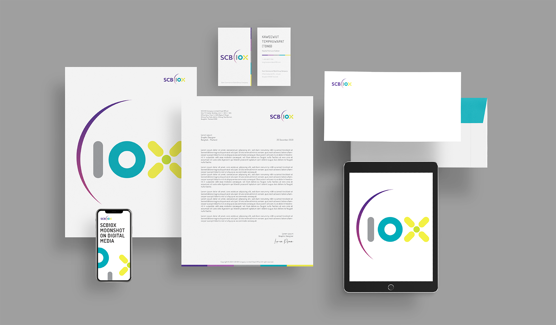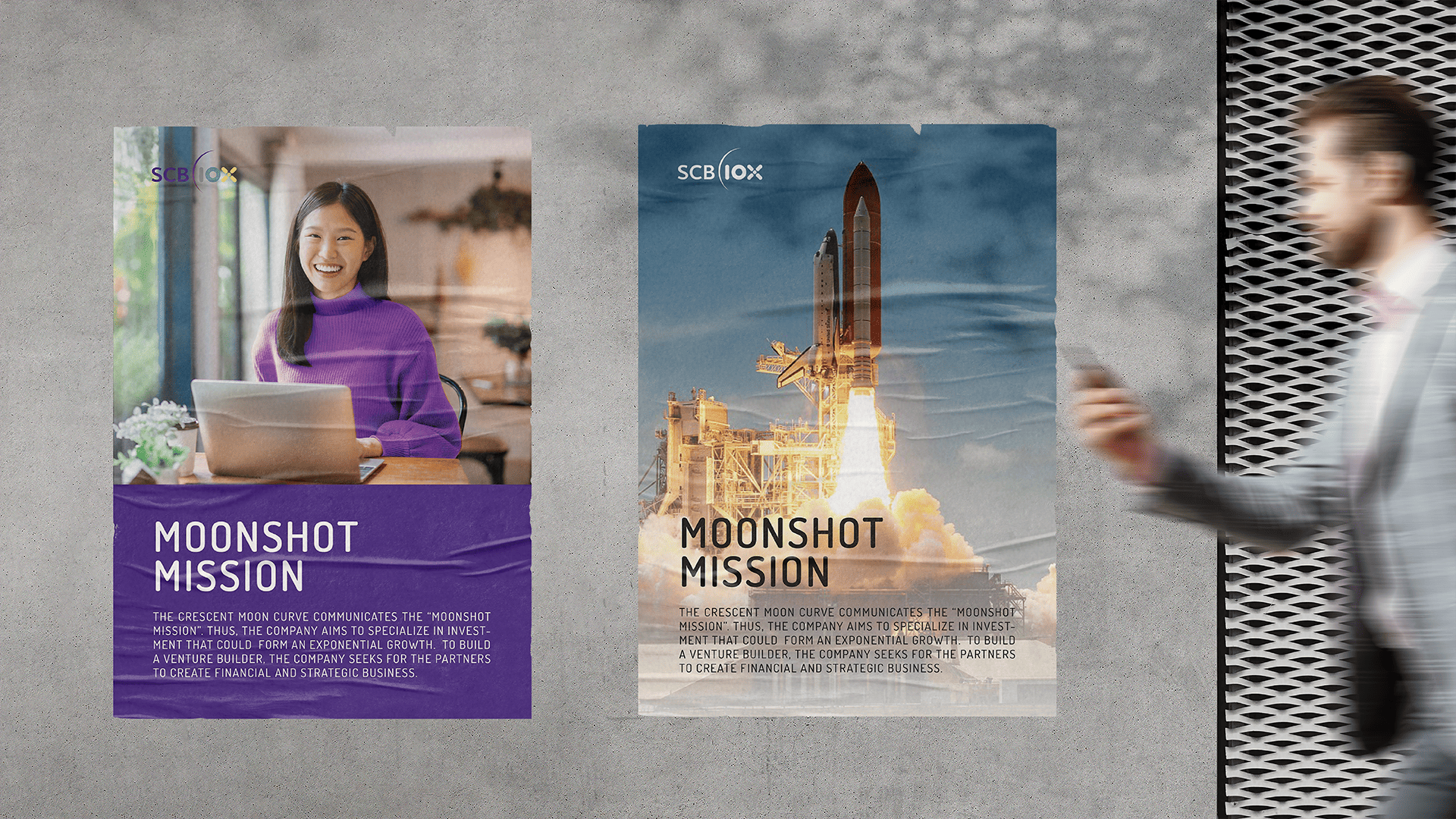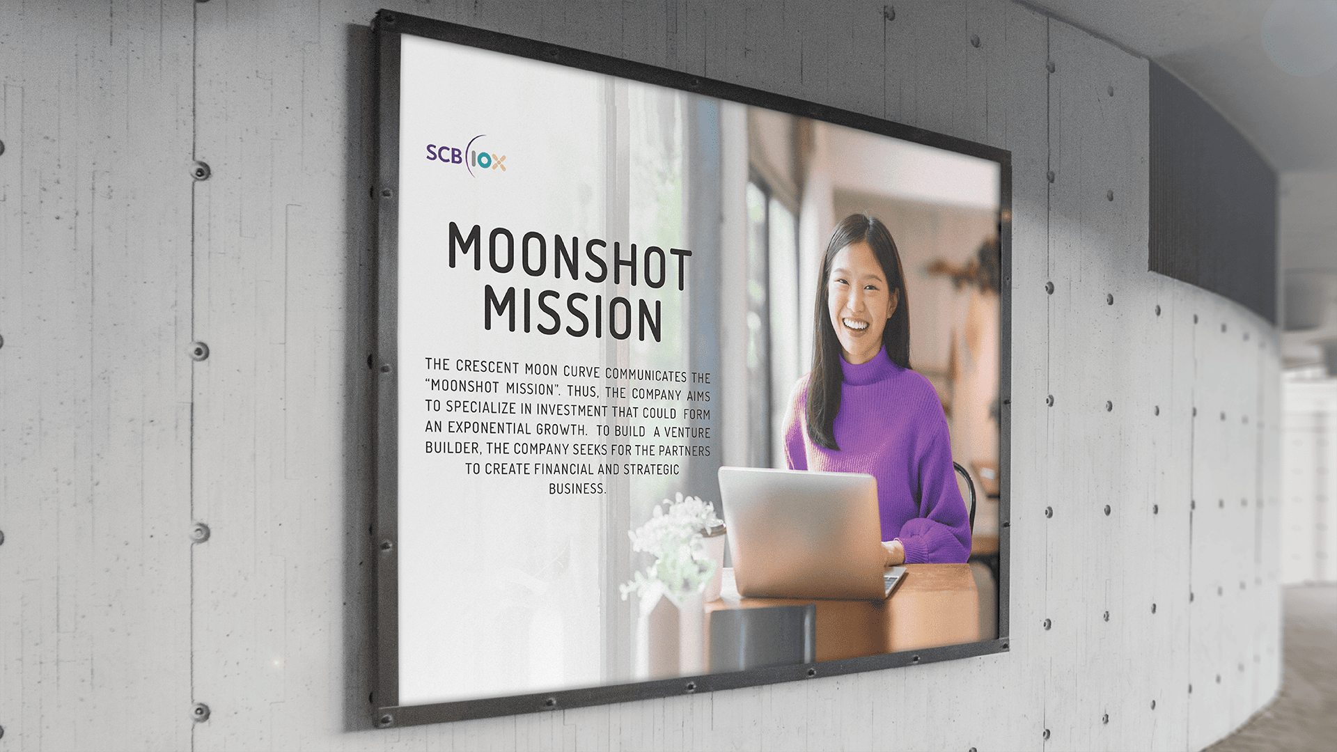 ‘Moonshot’ in the ambitious sense means an action or a plan to do the impossible task, to reach the impossible dream, to go countless extra miles to the moon and make it all possible. SCB 10X is a holding company under SCBX, with a “Moonshot Mission” to create long-term value through exponential technologies, innovations, and investment via two main pillars of Venture Capital and Venture Building. To create the visual identity for such cutting-edge character, we use the crescent moon to represent the moonshot mission in the most tangible manner. And with the company’s mission in hatching young entrepreneur dreams as well as searching for business and innovation alliance to assist young talents on their ways to be the unicorn; the number 10 is viewed as a binary digits which is used in coding the text, or any two-symbol system data that drives our digital era. As with the shape of OX, when seen horizontally, it can signify the people, the creator, which is always the heart of everything. Lastly, X alone is mathematical symbol of multiply, when viewing together with 10X, it implies that the exponential growth is never out of reach, as long as people stick together side by side.