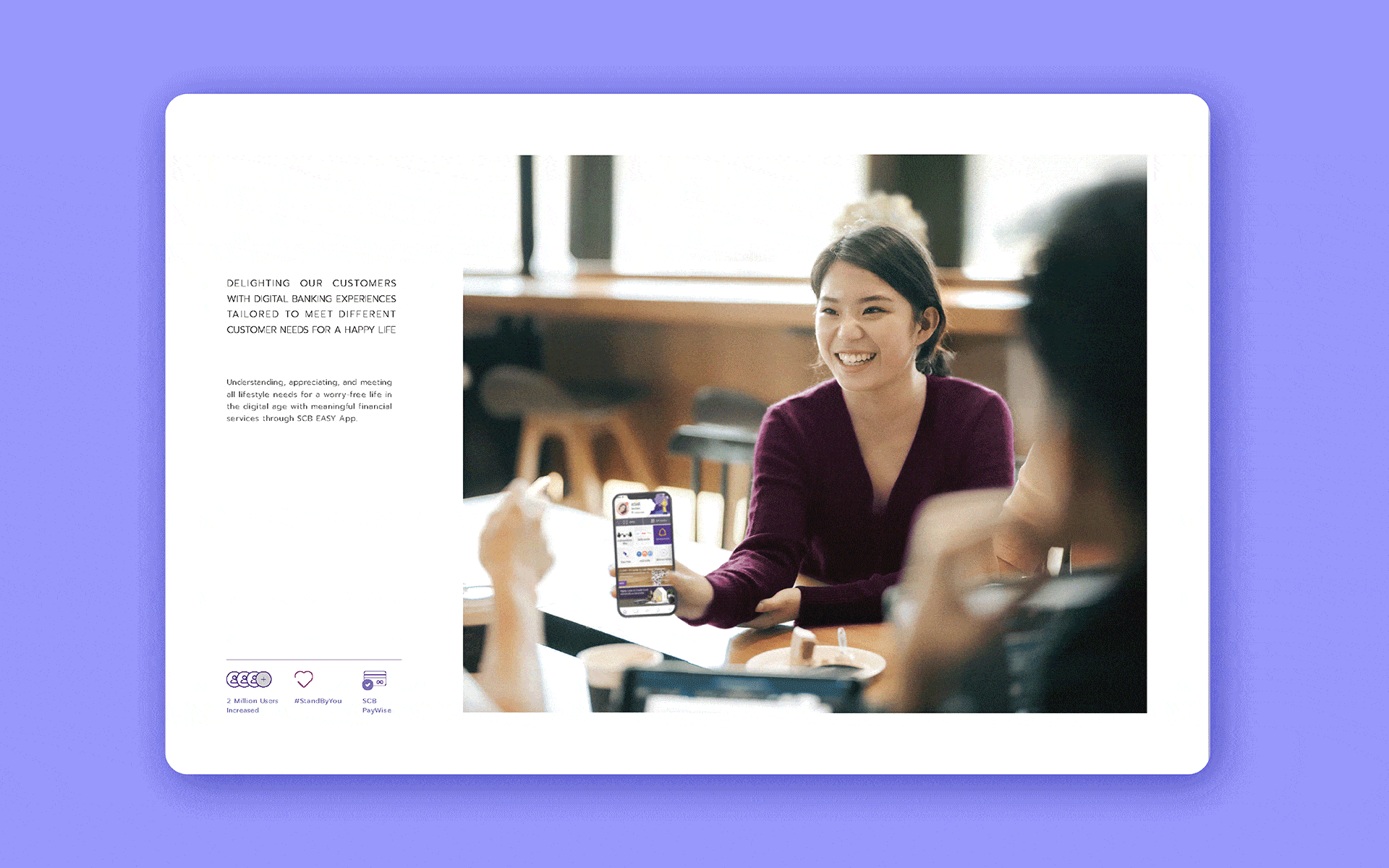 Since a digital banking has emerged in a timely fashion as we were entering digital era, SCB is committed to evolve and transform its corporate culture in order to always be relevant with the world and fully appreciate the varying needs of the clients. To tell a story of life in a digital culture which has already been a part of people’s lives today, we intentionally used the snapshot photos to reflect the flow of lifestyles that were unconsciously digitized. Only when observing closer, one can begin to realize how relevant SCB services are to people from all walks of lives, be it individual’s, SME’s, corporate’s, etc. This very seamlessness initially reflects the fuss-free transformation of SCB’s Digital Cultures.
