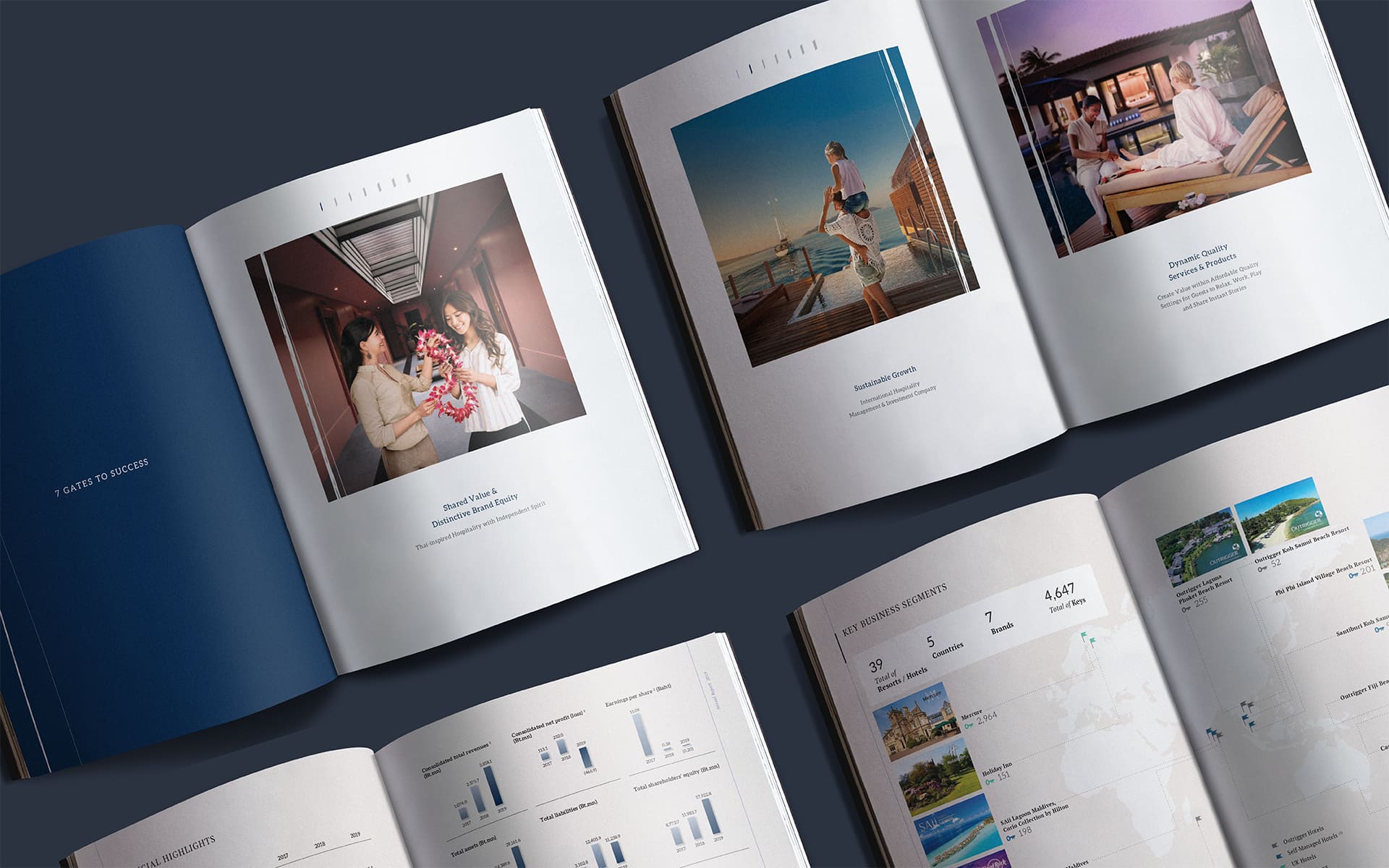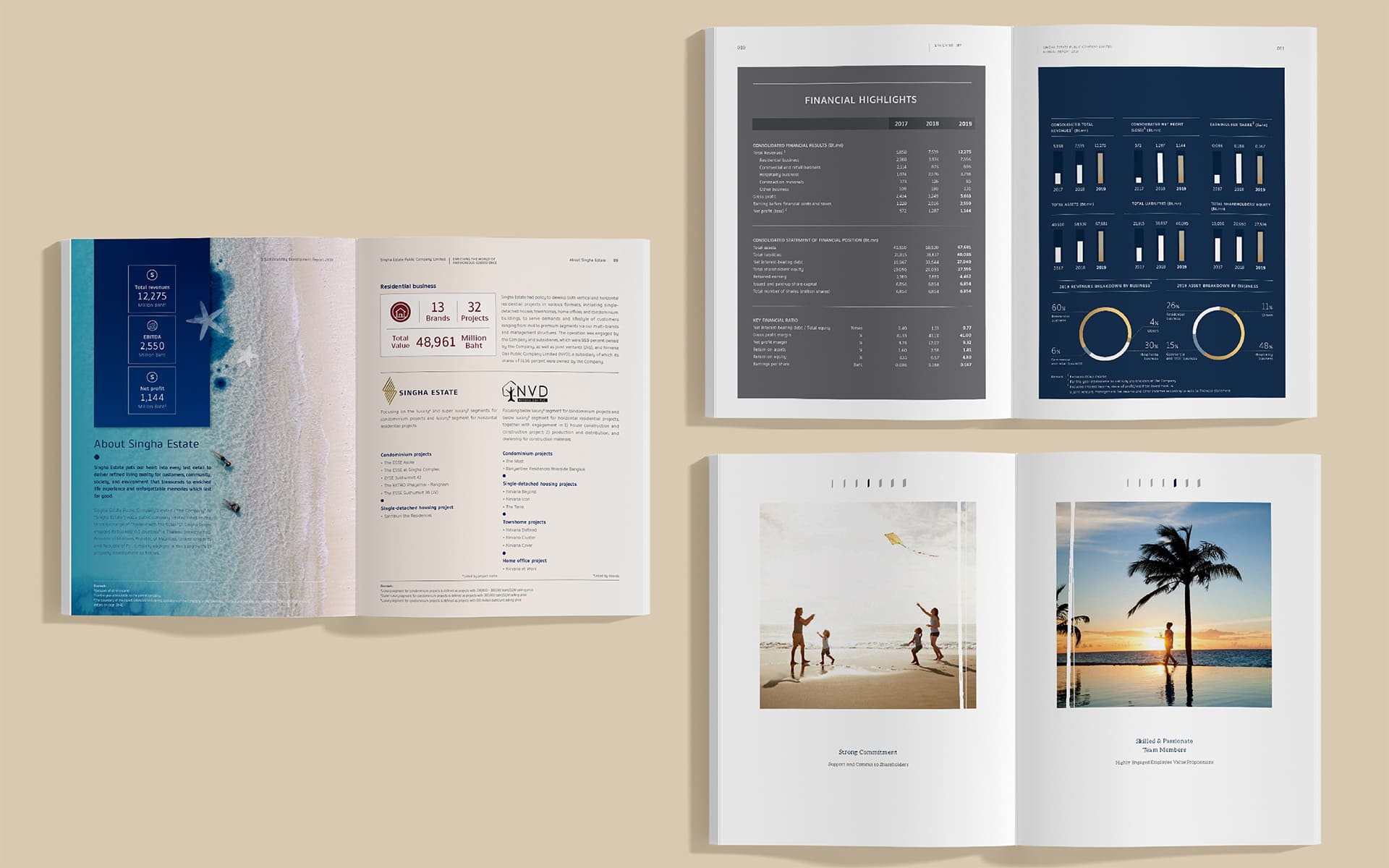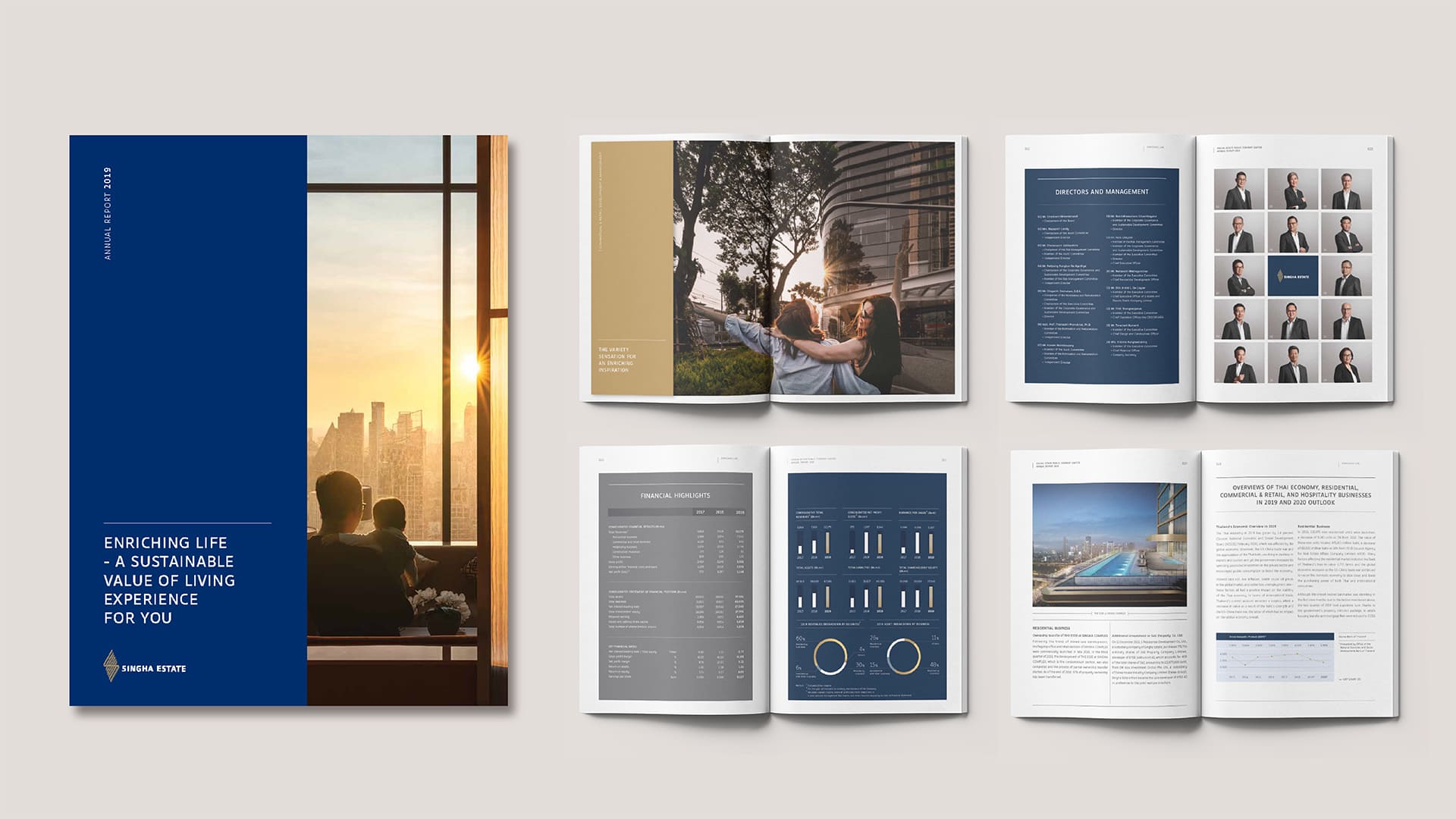 True value of a property is not merely materials nor designs of its construction. Singha Estate prides itself on being a true value creator that is meaningful to life. Fully committed to this precious goal, the company firmly emphasized all of its missions to be that of sustainability-focused, all for the future worth living in. With impeccable details in creating and running chain of businesses such as hotels, residences, and commercial properties; Singha Estate invested in crafting the perfect lifestyle worth experiencing in every moment, as well as sustainably in alignment with the goal of sustaining the pricelessness of ecosystem.To design an annual report for Singha Estate which consists of Singha Estate Annual Report, Sustainability Report, and S Hotels and Resorts Annual Report; we geared our communication to clearly echo the bespoke values of each various businesses while preserving the identity of Singha Estate as the boldest DNA of all. Apart from applying different key colours, the visual languages and each elements in the report also play crucial part in creating each business distinction. The candid style of picture reflects warmth and joy of experience that Singha Estate has committed to create, as stated in its slogan ‘Enriching Life, Enriching Tomorrow’.